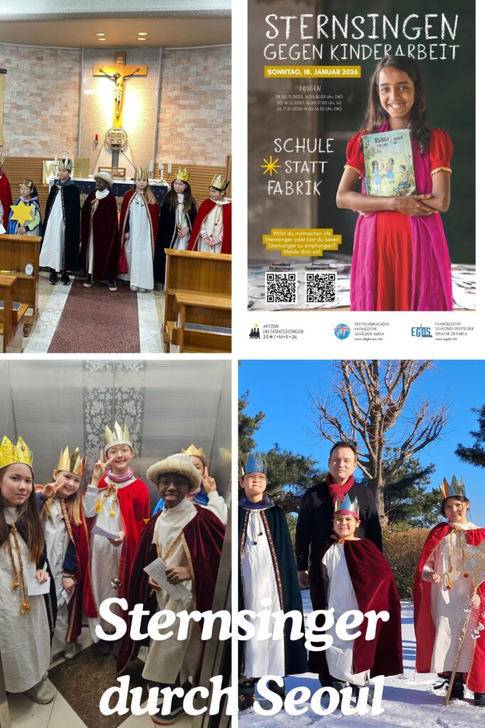 Und der Segen Gottes bleibe alle Zeit bei dir. Er sei unter deinen Füßen, er sei über dir. Er sei stets in deinem Herzen, sei der, der mit dir geht. Am Himmel strahlt ein Stern, der dafür steht. (Sternsingerlied: T+M: Daniela Dicker) Liebe der EGDS Verbundene, „Am Himmel strahlt ein Stern“ – so heißt eines der Sternsingerlieder, mit dem wir von Haus zu Haus durch die Straßen Seouls am 18. Januar 2026 ziehen werden. Drei Sternsingergruppen werden Familien in Seoul besuchen und den Segen der Heiligen 3 Könige Caspar, Melchior und Balthasar in die Häuser Seouls im Jahre 2026 bringen. Christus segne dieses Haus: Christus mansionem benedicat. Dieser Segen bleibt auch später sichtbar an den Häuserpfosten, ob durch Kreide oder einen Aufkleber angebracht. Die Residenz der Deutschen Botschaft ist auch immer ein Ziel, wenn Botschafter Georg Schmidt und Kulturreferent Martin Kasperek eine der Sternsingergruppe empfangen. Dieses Jahr unterstützen wir durch das Kindermissionswerk in Aachen Projekte für Kinder in Bangladesch unter dem Motto: Bildung statt Kinderarbeit. Wir laden Sie und Euch ein zum Ökumenischen Gottesdienst am Sonntag 18. Januar 2026 um 10 Uhr in der katholischen deutschsprachigen Kirchengemeinde, Hannamdaero 90. Die Sternsinger treffen sich bereits um 9 Uhr im Gemeindesaal auf der 2. Etage. Parkplätze sind leider nur sehr begrenzt vorhanden. Bitte nutzen Sie die öffentlichen Verkehrsmittel. Vielen Dank an allen Helfer:innen, Fahrer:innen, Eltern und natürlich auch den gastgebenden Familien, die die gesamte Aktion mit unterstützen. Ihre Pfarrerin Mi-Hwa Kong |
